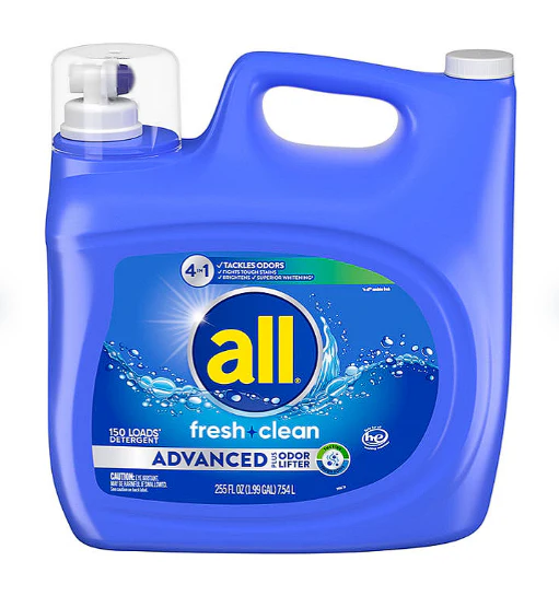 All Advanced 4-in-1 (150 lds.. 255 fl. oz.) tackles tough stains and uses patented odor-removal technology to keep laundry fresh. This giant bottle of stain remover detergent cleans up to 140 loads. making it perfect for busy households. housekeeping services and more.
