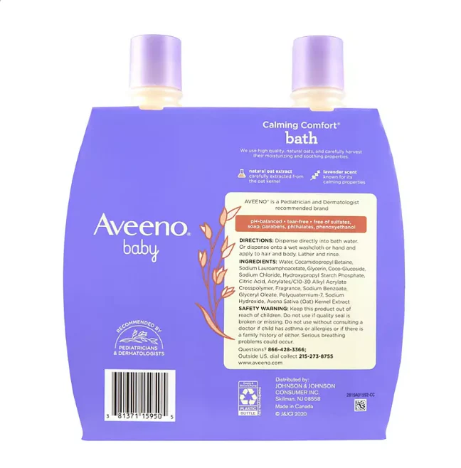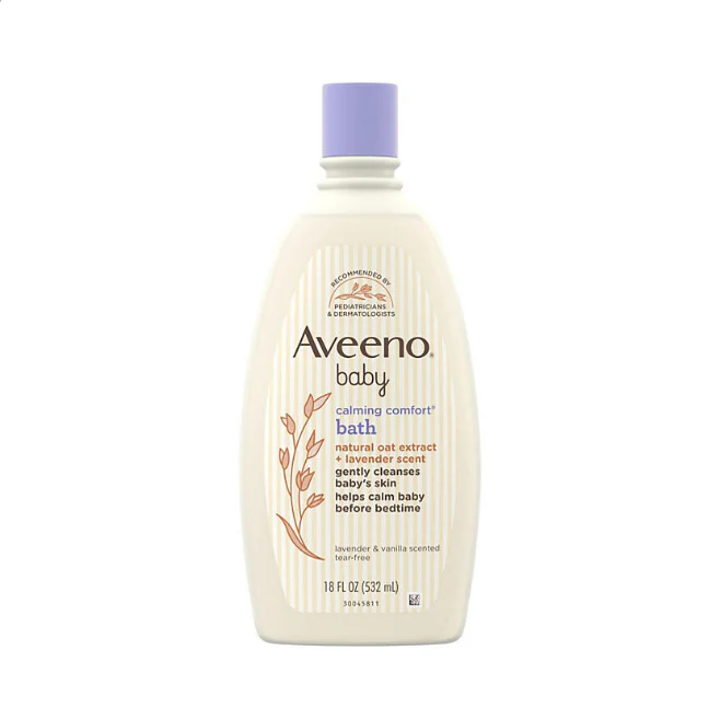 Aveeno Baby Calming Comfort Bath & Body Wash contains scents of lavender and vanilla��known for their calming and relaxing properties. Made with skin-soothing natural oat extract. this rich lathering baby bath and body wash is specially formulated for infants and is free of parabens. phenoxyethanol. sulfates and phthalates. The gentle formula of this bedtime baby bath cleanses and moisturizes baby’s delicate skin and hair and is shown to calm and comfort fussy infants when combined with a warm bath so baby sleeps restfully. From Aveeno. a pediatrician- and dermatologist-recommended brand. Aveeno Baby Calming Comfort Lavender scent Bath is tear-free. soap-free. non-drying. and gentle enough for everyday use during baby bath time as either a hair and body cleanser or calming bath.