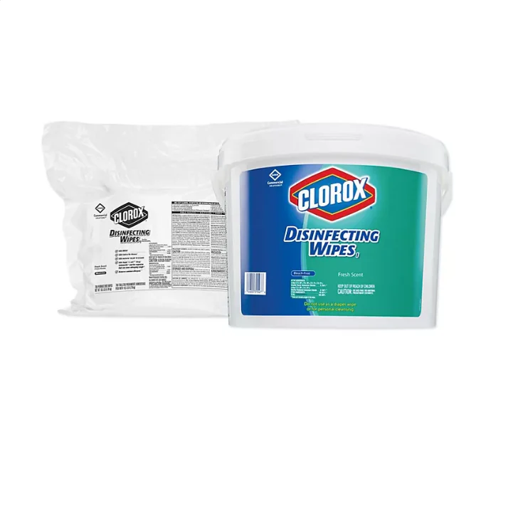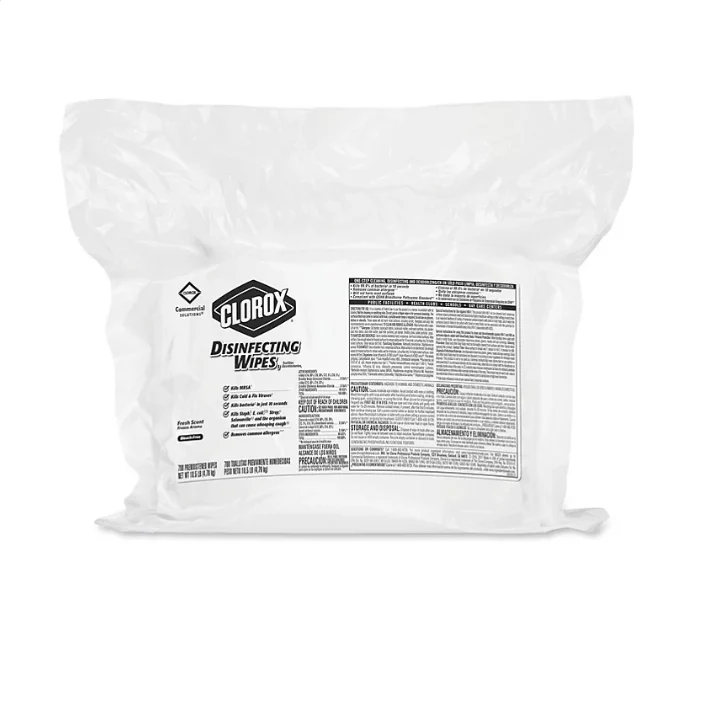 CloroxPro? Disinfecting Wipes clean and disinfect in one easy step. These disinfecting wipes are EPA-registered to kill 99.9% of germs on hard nonporous surfaces. including cold and flu viruses. the COVID-19 virus (SARS-CoV-2). E. coli. Salmonella. Staph. Strep. MRSA and the organism that can cause whooping cough. These wipes also remove common allergens like pet dander. pollen particles and grass. One wipe kills most viruses in as little as 15 seconds on a wide variety of surfaces. The premoistened. thick. antibacterial wipes are perfect for spills and dirt on a variety of hard. nonporous surfaces including acrylic. glass and vinyl. They quickly clean and disinfect high-touch germ hot spots such as doorknobs. handrails and faucets and are suitable for use on phones. keyboards and mouse. These sanitizing wipes are ideal for use in shared public spaces. offices. athletic facilities. schools. day care centers. busy healthcare environments. long term care and other commercial facilities. Applicable Material: Acrylic; Ceramic; Chrome; Fiberglass; Glass; Metal; Plastic; Tile; Vinyl; Wood; Application: Bathrooms; Day Care Centers; Gyms; Hospitals; Kitchens; Offices; Schools; Chemical Compound: Hexoxyethanol; Alkyl C12-18 Dimethylbenzyl Ammonium Chloride; Alkyl C12-14 Dimethyl Ethylbenzyl Ammonium Chloride; C12-14 Alcohols Ethoxylated Proproxylate; Isopropanol; Citric Acid; Color(s): White; Dirt Types: Bacteria; Dust; Fungus; Germs; Grease; Grime; Mildew; Mold; Soil; Viruses; Length: 7; Material(s): Nonwoven Fiber; Number of Plies: 1; Number of Towels/Wipes Per Container: 700; Packaging: Bag; Quantity: 2/Carton; Scent: Fresh Scent; Towel/Wipe Type: Disinfecting Wipes; Width: 7 Compliance Standards: EPA Reg. No. 67619-31; EPA List N. Post-Consumer Recycled Content Percent: 0%. Pre-Consumer Recycled Content Percent: 0%.