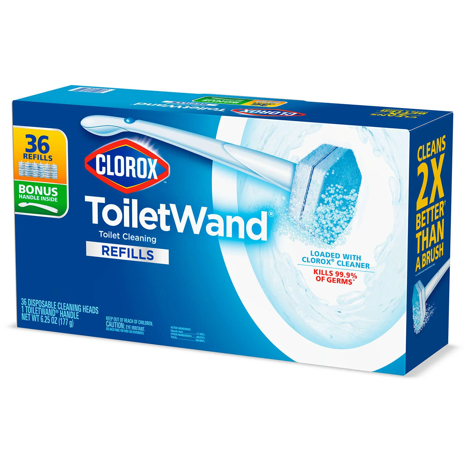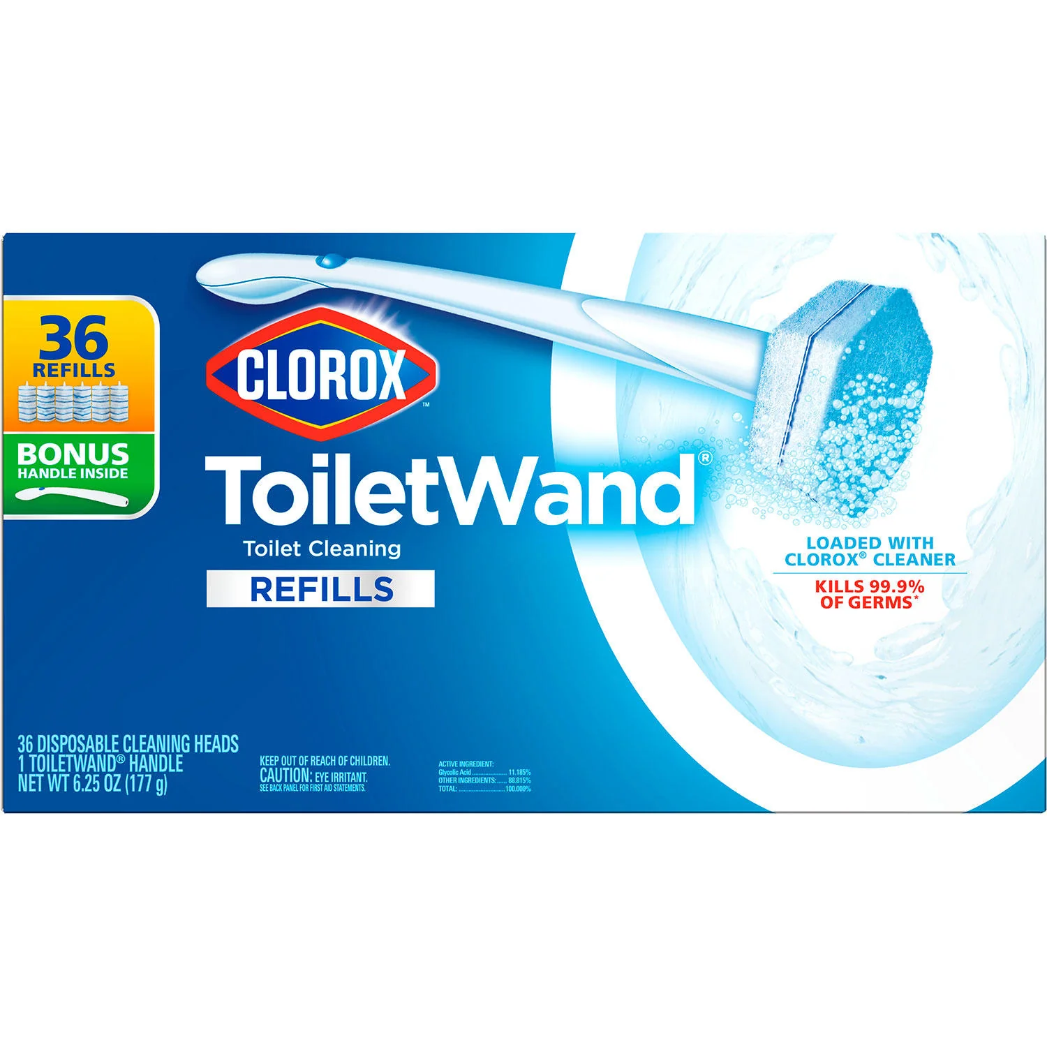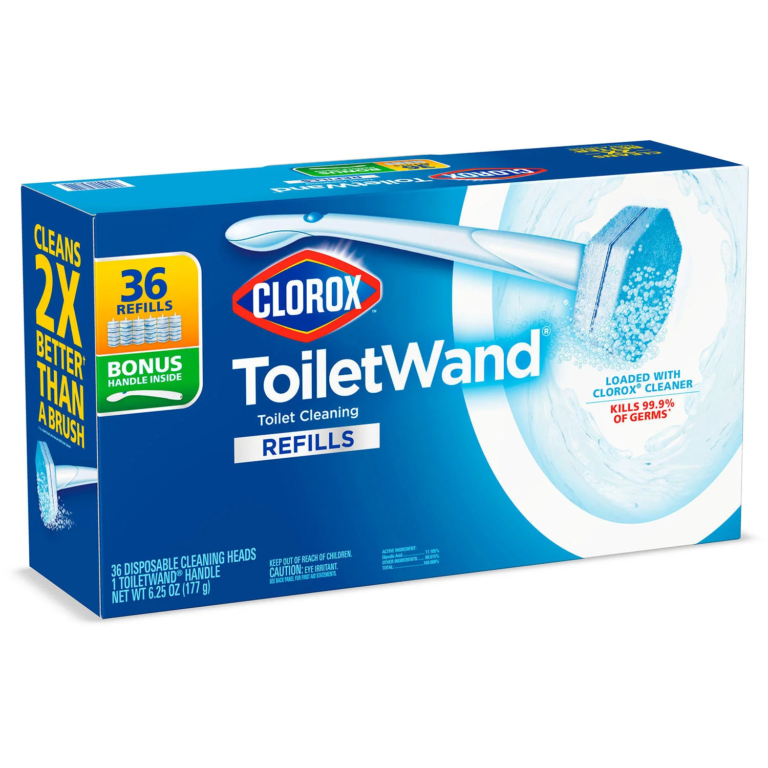 Clorox? ToiletWand? cleaning heads are preloaded with Clorox? Toilet Bowl cleaner to kill germs. disinfect and eliminate odors with ease. The toilet wand system. with its sponge-like head. powers through tough stains and disinfects your toilet. killing 99.9% of germs like staphylococcus aureus. salmonella enterica. rhinovirus type 37 and influenza A. It cleans hard to reach areas under the bowl rim with ease. Included in this pack are 36 refill heads plus 1 wand handle. Simply click the wand into a refill head. swish around the bowl to release the cleaner. scrub and toss the head away into the trash when done. Cleaning is a breeze with the Clorox? ToiletWand? Disposable Toilet Cleaning System.