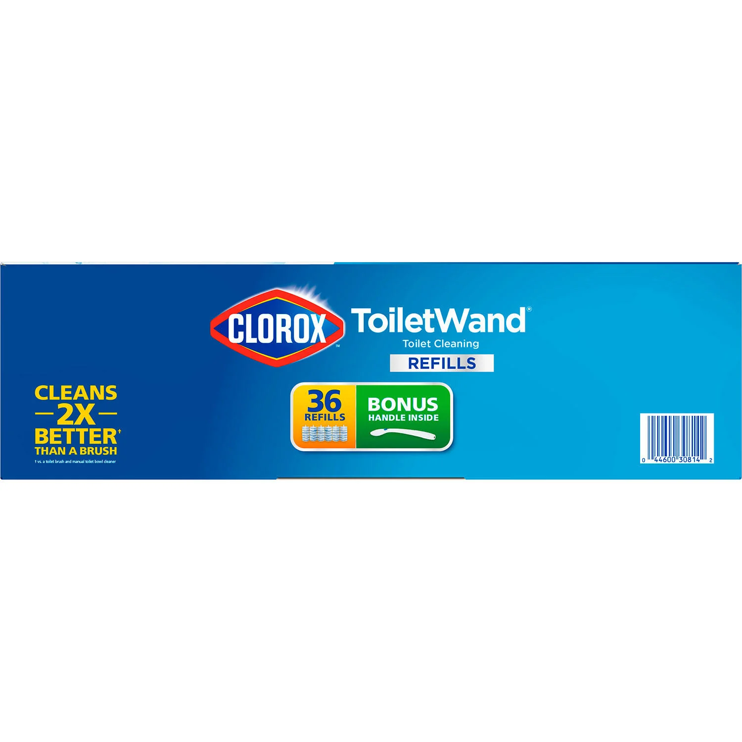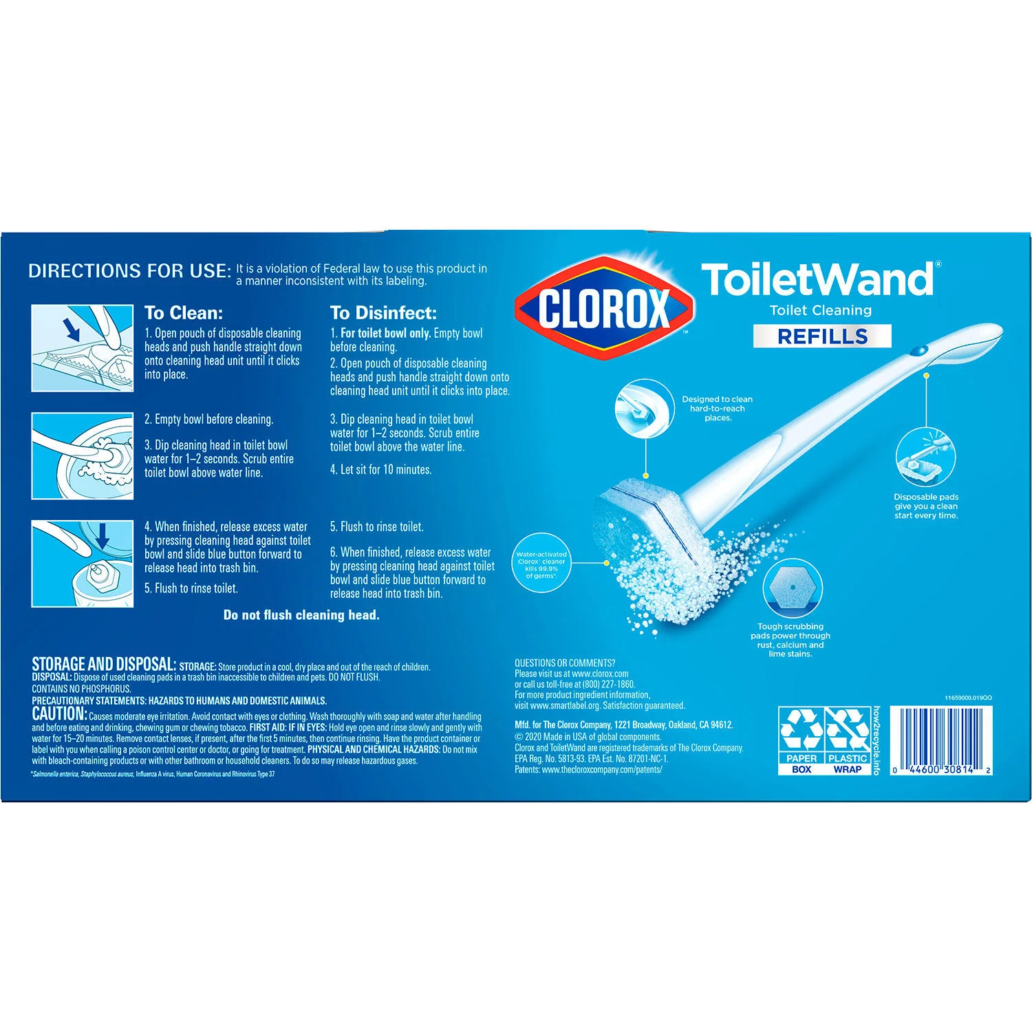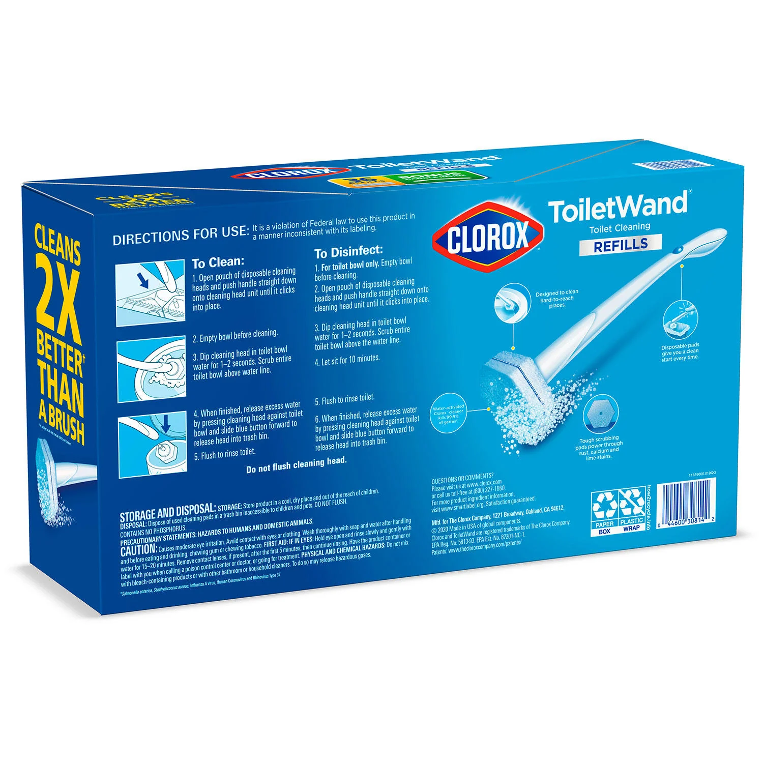 Clorox? ToiletWand? cleaning heads are preloaded with Clorox? Toilet Bowl cleaner to kill germs. disinfect and eliminate odors with ease. The toilet wand system. with its sponge-like head. powers through tough stains and disinfects your toilet. killing 99.9% of germs like staphylococcus aureus. salmonella enterica. rhinovirus type 37 and influenza A. It cleans hard to reach areas under the bowl rim with ease. Included in this pack are 36 refill heads plus 1 wand handle. Simply click the wand into a refill head. swish around the bowl to release the cleaner. scrub and toss the head away into the trash when done. Cleaning is a breeze with the Clorox? ToiletWand? Disposable Toilet Cleaning System.