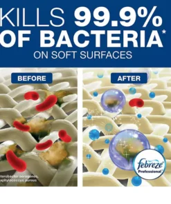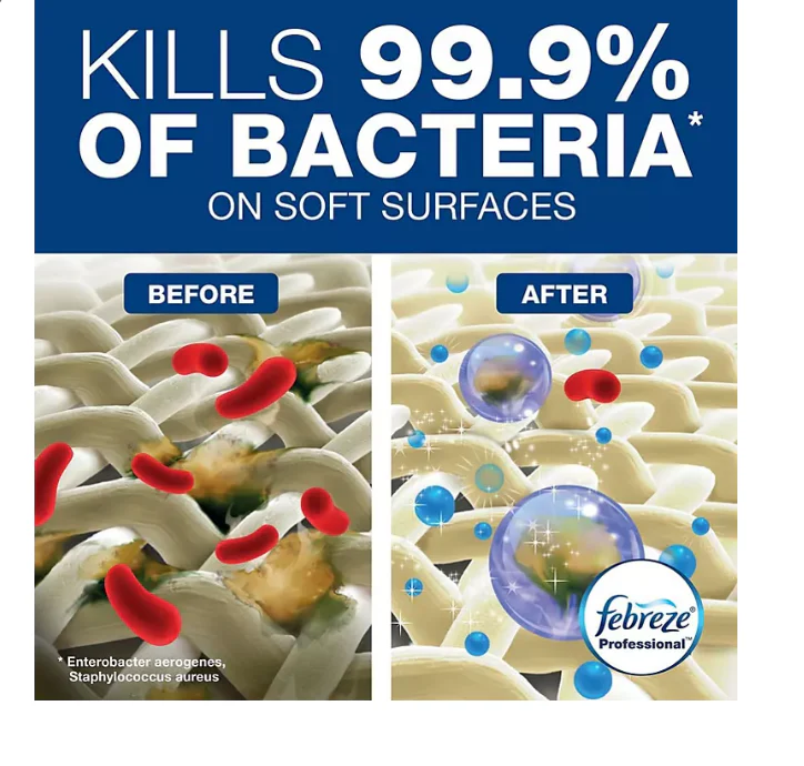 Soft surfaces that can’t be washed. such as mattresses and upholstered furniture. are harbors for harmful bacteria. mold and mildew. Febreze Professional Sanitizing Fabric Refresher gives you the same freshening power of Febreze PLUS the soft surface sanitization your environment needs. Proprietary technology goes to the source of odors and eliminates them. A light. fresh scent is left behind to leave the treated area smelling fresh and clean. Safe for virtually all fabrics. Spray soft surface until fully wet and the soft surface must remain wet for 5 minutes.