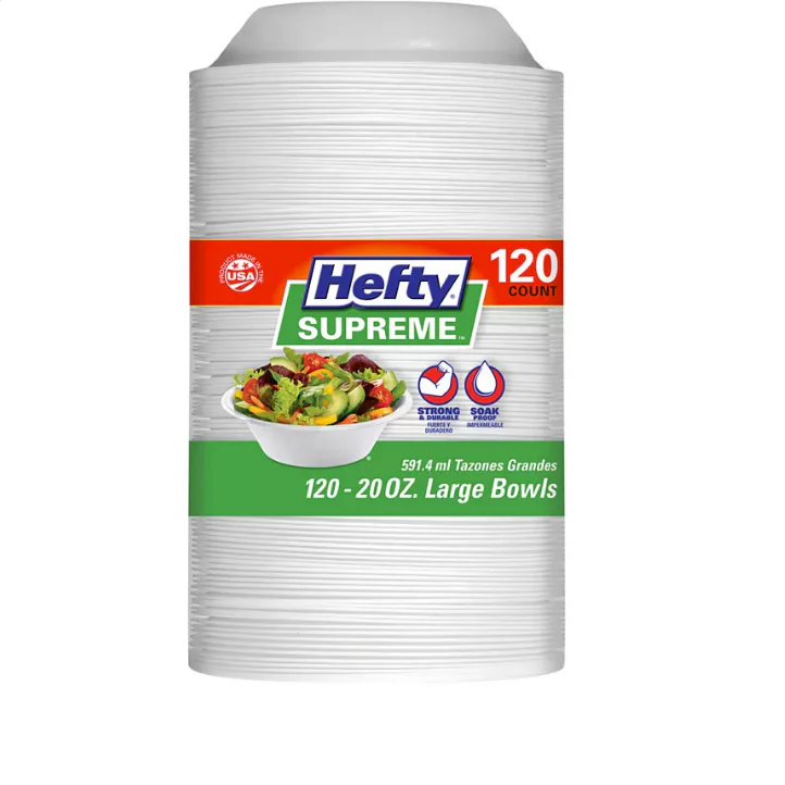 Instead of transporting. serving and cleaning a raft of bowls and dishes. simply bring this bag of 120 Hefty Supreme Foam Bowls to your next chili cook-off. ice cream social or potluck. These bowls can handle anything. and you’ll be able to handle the cleanup since these bowls can be easily disposed of after use. Perfect for everyday meals as well as special occasions. these foam bowls prevent messes while remaining affordable enough for everyday use. This value pack contains 120 disposable 20-oz. foam bowls.