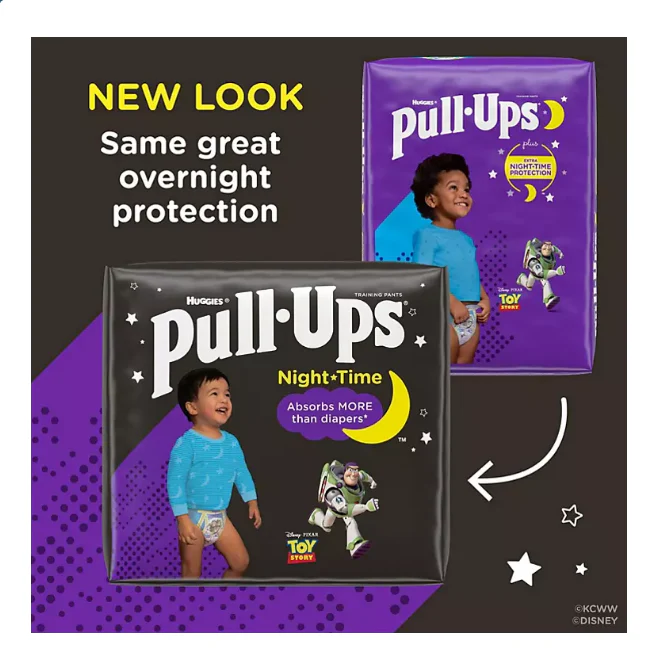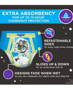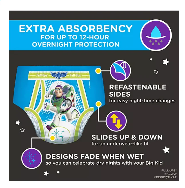 Overnight potty-training routines just got easier with Pull-Ups Night-Time Potty-Training Pants; the only disposable training underwear designed specifically for nighttime! These potty-training pants provide up to 12 hours of overnight protection and absorbs more than diapers*. so you can be rest assured your child is getting a good night’s sleep. The sides of each training pant are refastenable. allowing you to easily open and close for quick changes in the middle of the night without taking off your toddler’s clothes. Pull-Ups Night-Time Potty-Training Pants also offer soft. stretchy sides that slide up and down for an underwear-like feel to promote Big Kid independence. The Disney��Pixar graphics of Buzz Lightyear from Toy Story on the front and back are not only adorable. but also fade when wet so you can celebrate dry nights with your little one. No matter where your child is in his potty-training journey. the Pull-Ups brand can help.