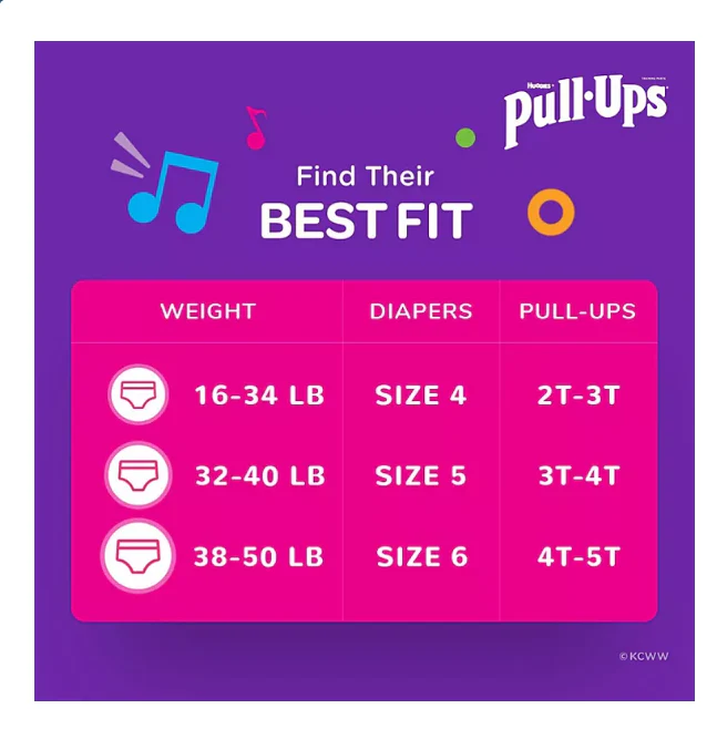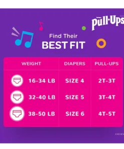 Pull-Ups Girls’ Training Underwear are available in sizes 2T-3T (16-34 lbs). 3T-4T (32-40 lbs). 4T-5T (38-50 lbs) and 5T-6T (50+ lbs).?