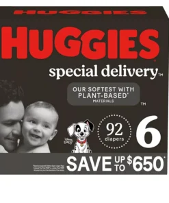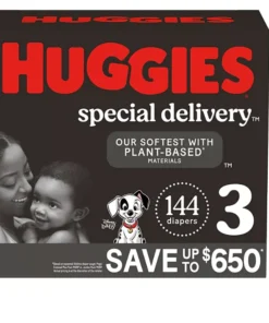 Give your baby our Softest Diaper Guaranteed*. Huggies Special Delivery Baby Diapers. love it or we’ll refund it 100%! Dermatologist-tested and clinically proven to be hypoallergenic. these disposable baby diapers are made with plant-based materials**. Special Delivery does not contain harsh ingredients and also are fragrance free. paraben free. lotion free and free of elemental chlorine bleach. They offer Huggies Trusted Protection with responsibly-sourced materials***. Each Special Delivery baby diaper absorbs wetness on contact and locks away moisture to support clean and healthy skin for your little one.