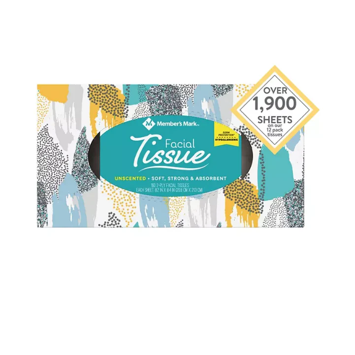 It��s easy to keep a box of premium tissues handy when you add Member��s Mark? Facial Tissues to your cart. With 12 decorative boxes and more than 1.900 quality tissues. you will always have plenty on hand for allergy. cold and flu seasons. Each tissue is ultra-soft. free of dyes and scents. making them perfect to care for sensitive skin and noses. And because these tissues are 2-ply strong. they are perfect for makeup removal. With this many boxes of Member��s Mark Facial Tissues. there should be a dry nose in every room of your home or office.