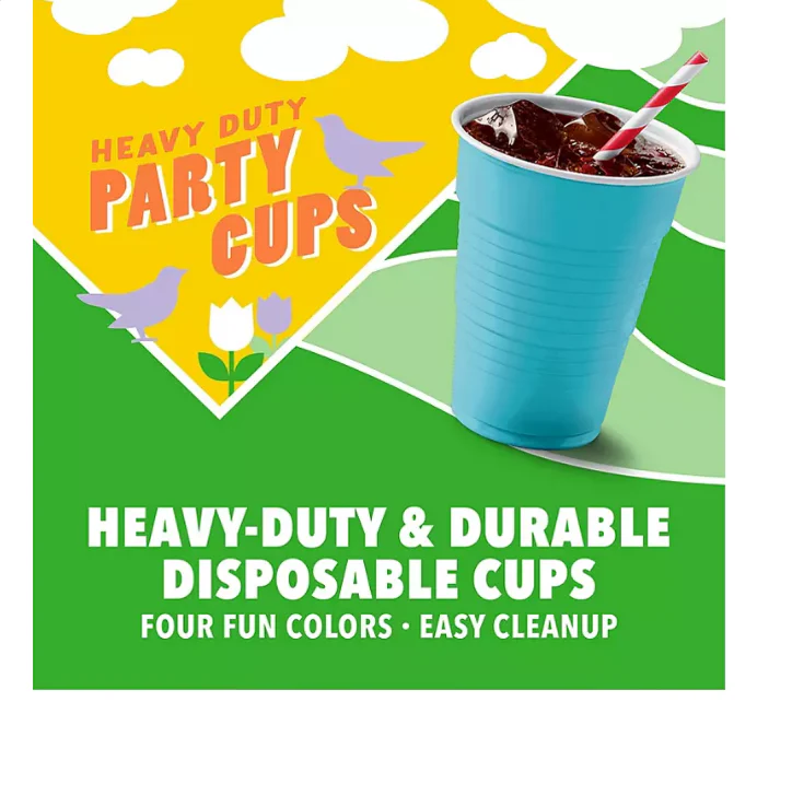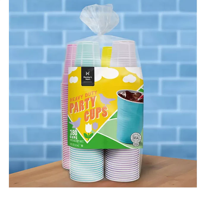 Keep these Member’s Mark Premium Quality Cups. Spring Colors (18 oz.. 180 ct.) on hand for serving beverages to a crowd without having to worry about washing dishes. These cups are great for camping. outdoor events. parties. picnics and everyday use. The pastel spring colors of yellow. purple. blue. and pink make these cups easily recognizable and add a pop to your event.