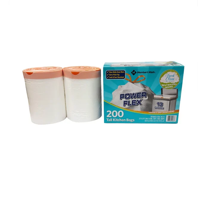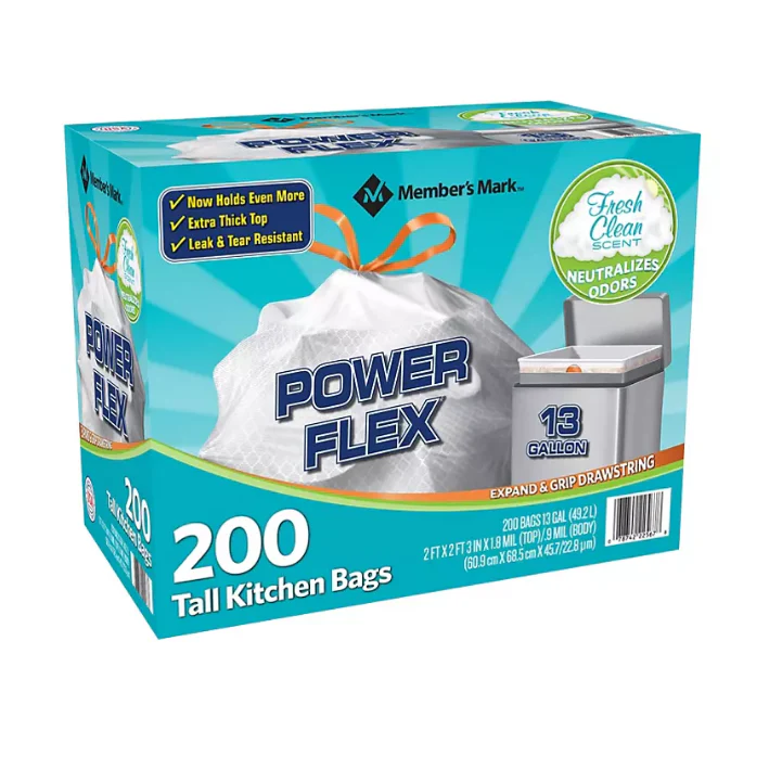 Expect more with Member’s Mark? Power Flex Tall Kitchen Simple Fit Drawstring Bags. These tall kitchen garbage bags have a remarkably rugged build to accommodate all of your kitchen trash. with a fresh scent that tackles tough odors.