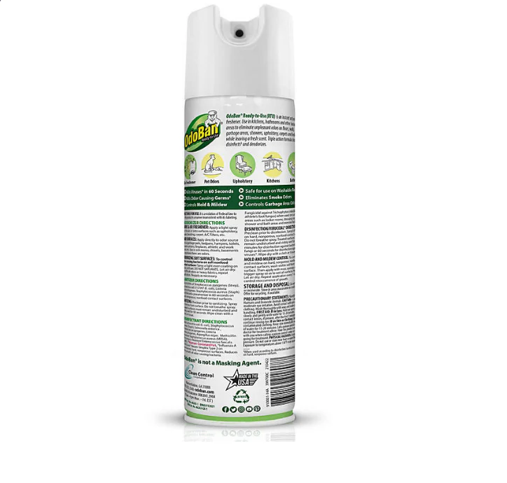 OdoBan Ready-to-Use Continuous Spray?is a multi-purpose cleaner. disinfectant. sanitizer. air freshener and odor eliminator. Features 360�� Pure Air Continuous Spray technology that uses natural air non-flammable propellant to spray at all angles- even upside down! OdoBan is a disinfectant that kills germs. bacteria and viruses when used according to disinfection/sanitization directions on hard. nonporous surfaces. Removes odors. including pet odors. urine odors. smoke odors. and musty odors. Instantly freshens and deodorizes fabrics. like clothing. shoes. furniture. upholstery. bedding. carpets and rugs. Use as a home or car air freshener and odor remover.? Renews automobiles; removes car odors. RV odors. mobile home odors. and camper odors like cigarette smoke smell and animal smell. For use on walls. tables. floors. carpets. toilets. grout. sinks. drains. bathtubs. countertops. appliances. furniture. drapes. laundry. bedding and more. When used as directed. OdoBan is safe for use on washable surfaces. including sealed natural stone. stainless steel. ceramic. tile. rubber. vinyl. and plastic. Safe for use on sealed natural stone countertops and surfaces. like granite. quartz. marble. ceramic and soapstone. Deodorizes carpets. removing pet urine smells. food smells and musty smells. Use in showers or basements to control mold and mildew; removes mildew odors. Excellent for water damage. sewage backup. fire and flood restoration. It is streak free and leaves no residue.
