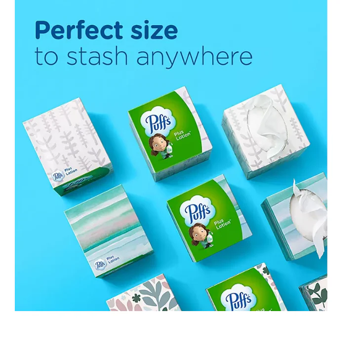 Whether you’re sick in bed. suffering from allergies. or just stocking up. Puffs Plus Lotion facial tissues protect noses from turning red. Puffs Plus Lotion is our most soothing* facial tissue with lotion and offered in a Mega Cube box with 72 sheets per box. Mega cube has 50% more sheets**. Ordinary tissues can leave your nose raw. but no one thinks about the importance of good tissues until their nose is already sore and red. Puffs Plus Lotion is the perfect tissue for when you have a sore or runny nose and are in need of extra softness for any cold. flu. or allergy. Dermatologist-tested to be gentle on sensitive skin. Puffs Plus Lotion facial tissues have air fluffed pillows and lock in moisture better than regular tissues to help soothe the irritated skin commonly caused from rough or thin tissues. Puffs tissues are certified by the Forest Stewardship Council and Preferred by Nature. and made of material from well-managed. FSC-certified forests and other controlled sources. For every tree Puffs uses. at least one is regrown. Puffs cartons are also made from 100% recycled paperboard. It’s no wonder that Puffs Plus Lotion is America’s #1 selling Lotion Tissue brand. so stock up on Puffs Plus Lotion Family boxes for every room. A nose in need deserves Puffs indeed!