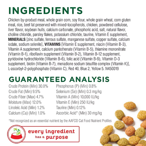 Chicken By-product Meal. Whole Grain Corn. Soy Flour. Whole Grain Wheat. Corn Gluten Meal. Rice. Beef Fat Preserved With Mixed-tocopherols. Chicken. Powdered Cellulose. Liver Flavor. Soybean Hulls. Calcium Carbonate. Phosphoric Acid. Salt. Natural Flavor. Choline Chloride. Parsley Flakes. Potassium Chloride. Taurine. Vitamin E Supplement. Minerals [Zinc Sulfate. Ferrous Sulfate. Manganese Sulfate. Copper Sulfate. Calcium Iodate. Sodium Selenite]. Vitamins [Vitamin E Supplement. Niacin (Vitamin B-3). Vitamin A Supplement. Calcium Pantothenate (Vitamin B-5). Thiamine Mononitrate (Vitamin B-1). Riboflavin Supplement (Vitamin B-2). Vitamin B-12 Supplement. Pyridoxine Hydrochloride (Vitamin B-6). Folic Acid (Vitamin B-9). Vitamin D-3 Supplement. Biotin (Vitamin B-7). Menadione Sodium Bisulfite Complex (Vitamin K)]. L-ascorbyl-2-polyphosphate (Vitamin C). Red 40. Blue 2. Yellow 5. N450019