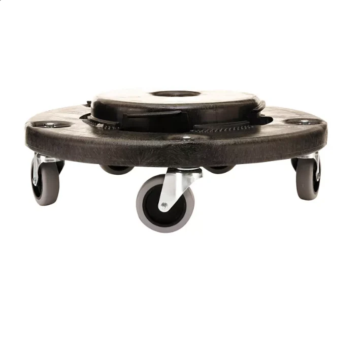 The Rubbermaid Commercial BRUTE? Trash Can Dolly provides a steady. mobile base for BRUTE trash cans from 20 to 55 gallons. 5 rugged. non-marking casters move fully loaded BRUTE trash cans smoothly even across rough and uneven surfaces. Constructed of sturdy structural foam. these garbage can dollies can transport up to 250 lbs. quickly and quietly through any facility while an innovative twist-lock design keeps receptacles securely mounted on the dolly. Capacity (Weight): 250 lbs; Caster/Glide/Wheel Type: Swivel Casters; Color(s): Black; Dolly Size: 18 dia x 6.63; For Use With: Brute? 20-Gallon. 32-Gallon. 44-Gallon. and 55-Gallon Round Waste Containers; Number of Wheels: 4 Recycled Comments: Contains a minimum of 30% post-consumer recycled content.