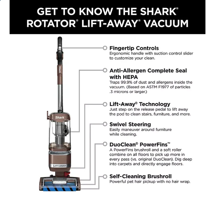 The Shark? Rotator? Pet Pro is equipped with DuoClean? PowerFins?. a two-brushroll system that digs deeps into carpets. directly engages floors. and picks up more in every pass (vs. original DuoClean). The self-cleaning brushroll eliminates hair wrap as you clean��it��s engineered to pick up more hair. with no hair wrap (vs. Shark bristle nozzles). Shark��s Lift-Away? technology lets you lift away the pod to clean above-floor with ease. Tackle stairs. shelves. and reach up high with powerful suction. Plus. the Lift-Away pod is ultra-lightweight. making it simple to hold with one hand while you target messes with the other hand. Anti-Allergen Complete Seal traps 99.99% of dust and allergens inside the vacuum. keeping them out of the air you breathe. (Based on ASTM F1977 of particles 0.3 microns or larger.) The LED lights on the nozzle illuminate hidden debris around your home. Plus. advanced swivel steering heightens the maneuverability of this vacuum. to access tighter spaces and move around furniture. This vacuum comes with a Pet Power Brush to pick up pet hair and loose debris from upholstery and other surfaces. and an Under-Appliance Wand to clean under and behind hard-to-move appliances and furniture. Plus. you get 2 bonus accessories: a Crevice Tool for tight spaces. and an Upholstery Tool to deep-clean furniture.